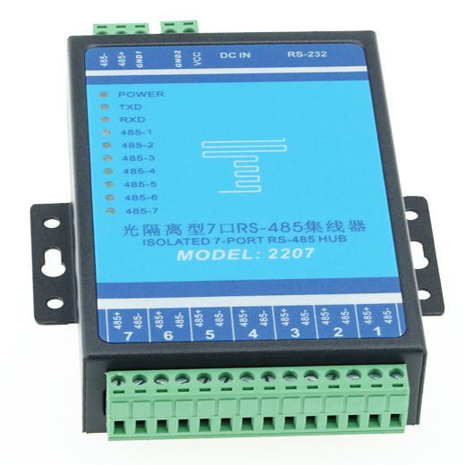 YT-2207是一款7口工業(yè)級(jí)光隔離型RS-485集線器,YT-2207七口光隔離型485集線器可以提供更加靈活的RS-485星型總線結(jié)構(gòu),RS-485接口輸入,輸出端均采用獨(dú)立驅(qū)動(dòng)方式,改變?cè)锌偩€的單一式結(jié)構(gòu)為網(wǎng)絡(luò)結(jié)構(gòu),給工程建設(shè)及系統(tǒng)的穩(wěn)定性帶來(lái)極大的好處。工業(yè)級(jí)光電隔離:為所有的RS-485接口提供2.5KVrms的光電隔離,有效的解決了外界雷擊浪涌和地電位差帶來(lái)的傳輸問(wèn)題。數(shù)據(jù)流向自動(dòng)控制,通過(guò)硬件解決數(shù)據(jù)流向問(wèn)題,自動(dòng)辨別和控制數(shù)據(jù)傳輸方向。 具有短路開(kāi)路保護(hù)功能,具有RS-485端口故障報(bào)警功能,并能自動(dòng)切斷故障端口,這種設(shè)計(jì)能夠保證當(dāng)其中連接的RS-485端口設(shè)備發(fā)生故障時(shí),出現(xiàn)問(wèn)題的RS-485端口將被隔離,以確保其他網(wǎng)段的設(shè)備正常工作