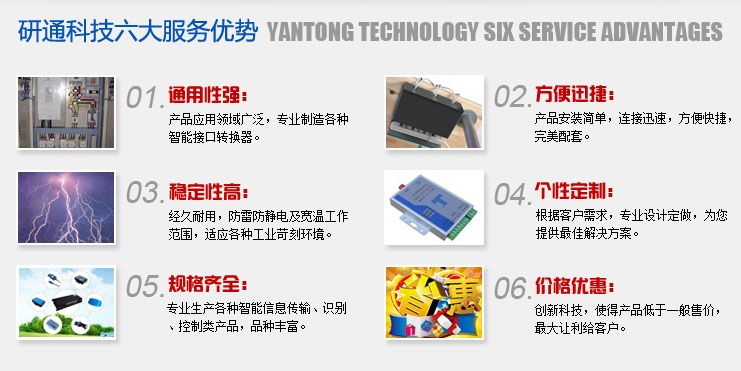 深圳市研通科技有限公司是一家專門研發(fā)生產(chǎn)通訊接口轉(zhuǎn)換器產(chǎn)品的專業(yè)廠家,為了保證產(chǎn)品品質(zhì),研通公司所有產(chǎn)品均采用原廠原裝芯片生產(chǎn),主要產(chǎn)品有:RS232轉(zhuǎn)RS485/422轉(zhuǎn)換器系列、RS485集線器系列、RS232/485/422中繼器、TCP/IP轉(zhuǎn)RS232/485/422系列、USB/PCI轉(zhuǎn)RS232/485、光纖轉(zhuǎn)232/485/422、RS232/485光電隔離器、光纖網(wǎng)絡(luò)收發(fā)器、開關(guān)量轉(zhuǎn)RS232/485、工業(yè)級以太網(wǎng)交換機(jī)、雙絞線/光纖KVM延長器、數(shù)字視頻光端機(jī)系列。另外可根據(jù)客戶需求定做各種智能信息傳輸、識別、控制類產(chǎn)品。